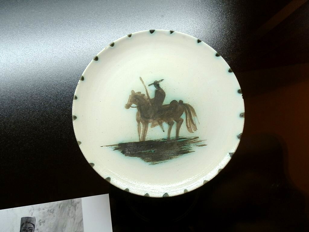 The picador was a common theme for Picasso in his greater oeuvre and it factors onto his ceramics often as well. This interest comes from his childhood, when he used to attend bullfights in Spain. He was deeply attracted to the adventure and myth of the bull fight, and it makes for compelling works of art.